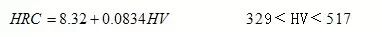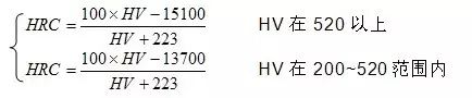 此公式用我國公布的黑色金屬硬度標(biāo)準(zhǔn)數(shù)據(jù)進(jìn)行換算,其HRC誤差基本上在±0.4 HRC 范圍內(nèi),其最大誤差也僅士0.9HRC,計算的HV誤差最大為±15HV。